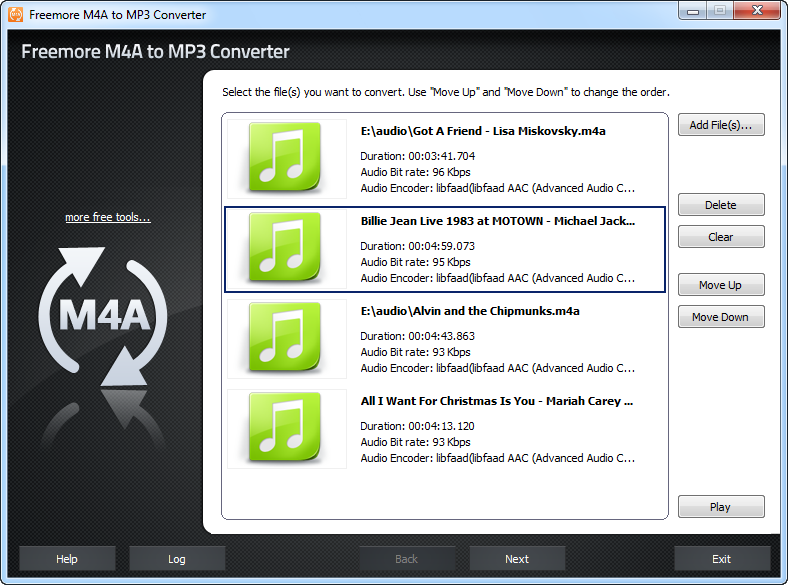 Freemore M4a to MP3 Converter allows you to batch convert dozens of files in specified order without waiting for each conversion to finish. The batch conversion helps a lot when dealing with lots of huge size files, saves your much time and offers you more convenience.