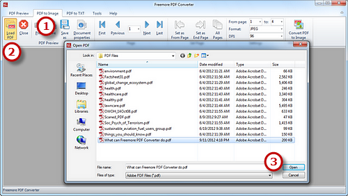 Launch Freemore PDF Converter and click "PDF to Image" (1). Then click "Load PDF" (2) to choose a PDF file you want to convert and click "Open" (3) to input it to the PDF to image conversion window.