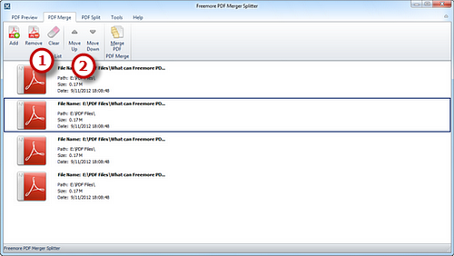 Launch Freemore PDF Merger Splitter and click "PDF Merge" (1). Then click "Add" (2) to input PDF files that you want to merge into a new PDF file. Press Ctrl or Shift key to select multiple PDF files in the Open dialog. Click "Open" (3) to input them to the PDF merger window.