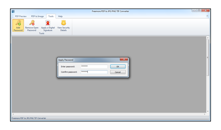 Freemore PDF to JPG PNG TIF Converter provides a password protection function for users to add password to PDF files to control who has access to your PDF file. The protection encrypts the contents of the PDF so it can't be previewed, printed or indexed, then it applies a password. On contrary, you can remove the password added to unlock PDF file to modify, print or copy secured files.