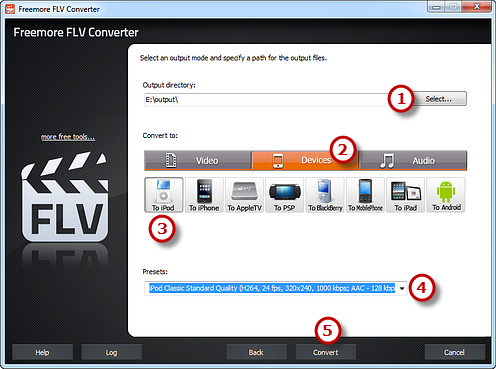 Click "Select..." button (1) to choose an output folder to backup the output files. Click "Devices" tab (2) to choose "To iPod" (3) as an output format (there are 3 tabs for output formats: "Video", "Devices" & "Audio" and each tab contains various output formats). Then, adjust the output quality with the well-configured presets for every format in the "Presets" (4) dropdown list. Click "Convert" (5) to start conversion.