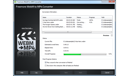 Freemore WebM to MP4 Converter allows you to batch convert dozens of files in specified order without waiting for each conversion to finish. The batch conversion helps a lot when dealing with lots of huge size files, saves your much time and offers you more convenience.